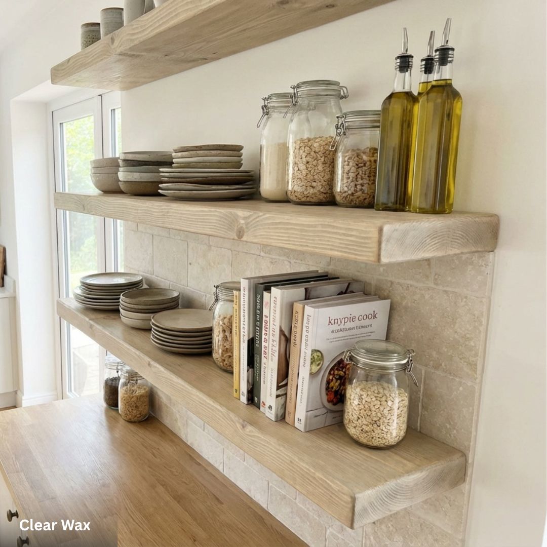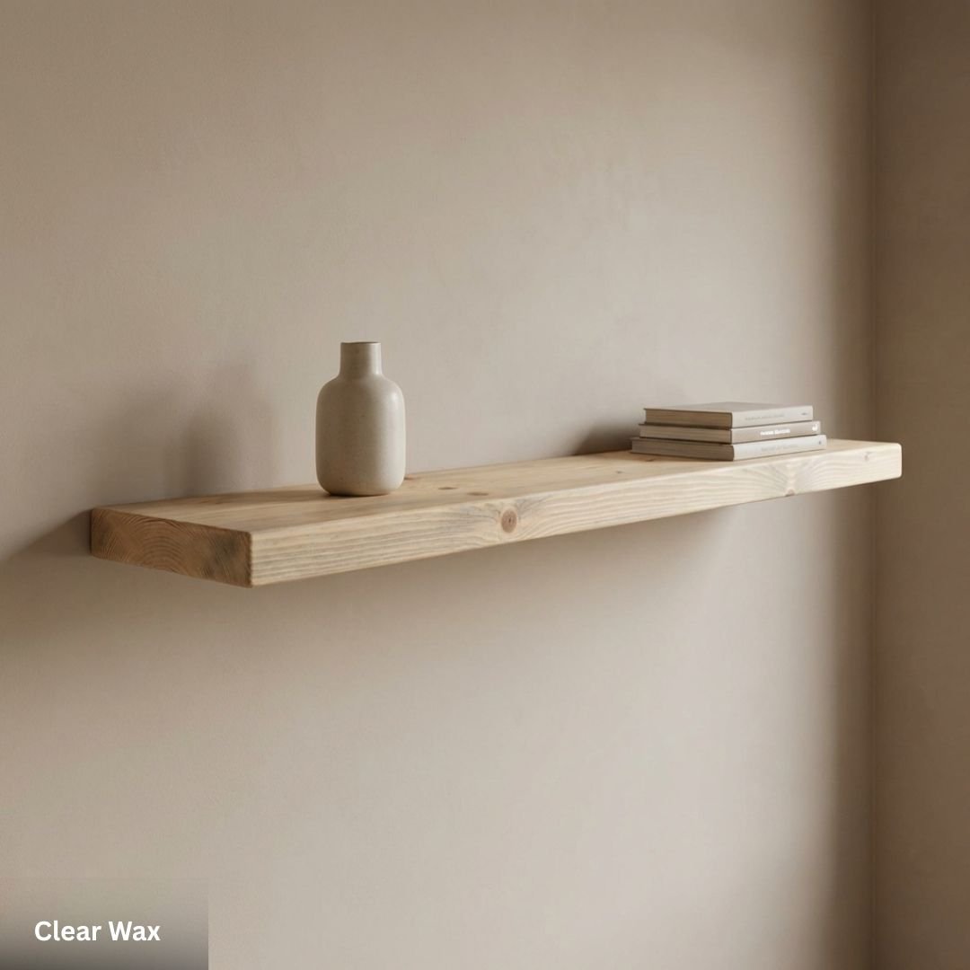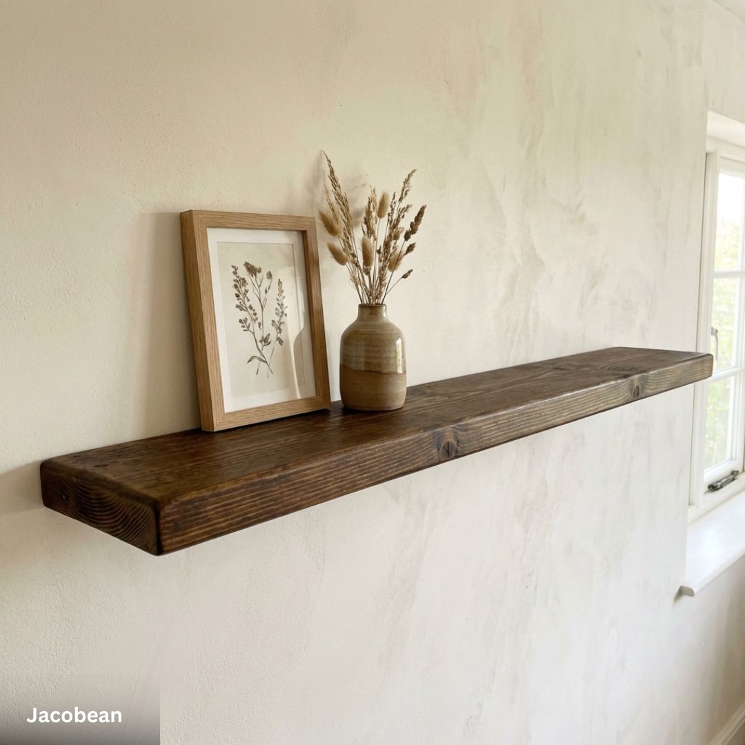 Our handmade to order rustic floating shelves are made from reclaimed scaffold boards in our Bedfordshire based workshop. Each piece of wood is carefully selected and hand finished to a very high standard. This includes sanding, finishing with two generous coats of 'Fiddes' supreme wax and adding optional metal end bands to each end of the shelf.The price is per shelf and each shelf is 15cm depth x 3.5cm thickness and comes with optional 2 x floating brackets.