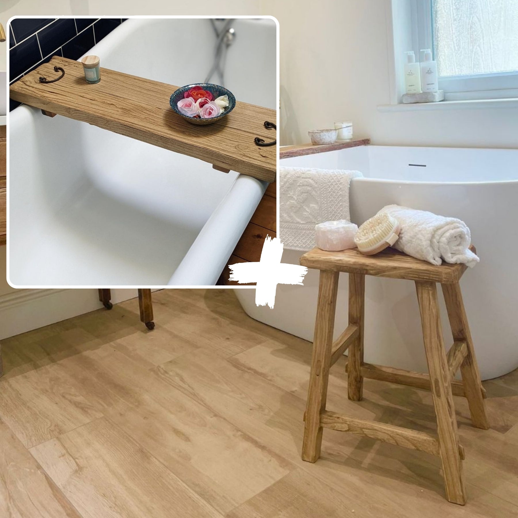 Both the bath board and stool are made from solid reclaimed elm wood, chosen for its natural grain and durability. Every surface tells a story — knots, tones, and markings unique to each piece. The bath board rests securely across your tub, providing space for candles, books, or a cup of tea, while the vintage stool offers a sturdy companion for seating or placing essentials within reach.