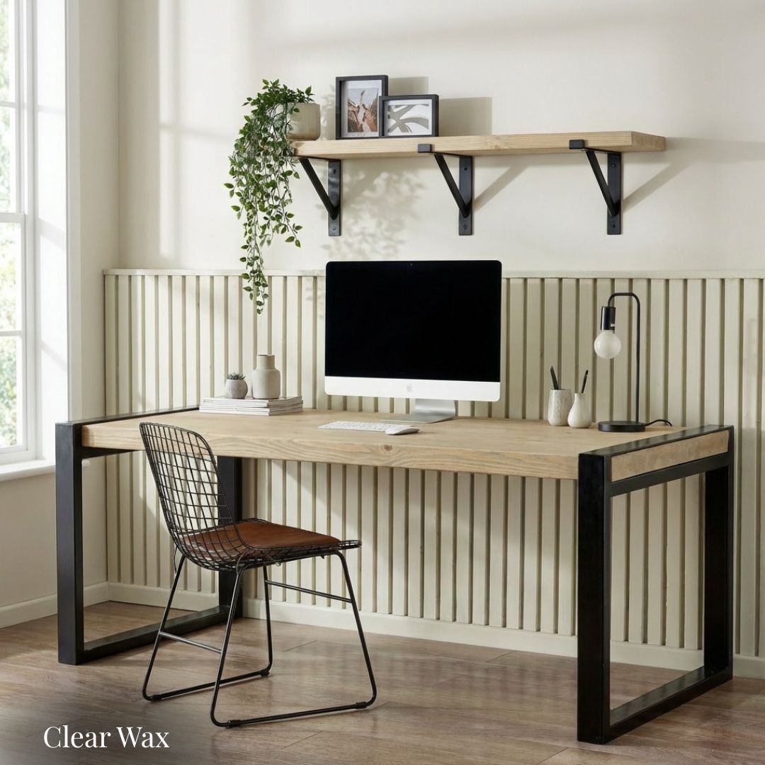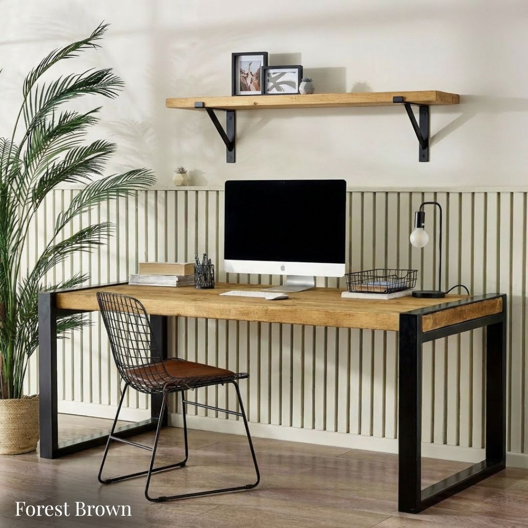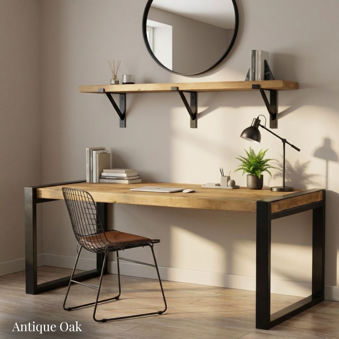 The Urban Loft Industrial Office Desk blends rugged farmhouse character with modern industrial strength. Its thick, reclaimed scaffold-board desktop features a beautifully textured grain, expertly finished by hand with two coats of Fiddes Supreme Wax to enhance its natural beauty and depth.generous coats of Fiddes Supreme Wax.