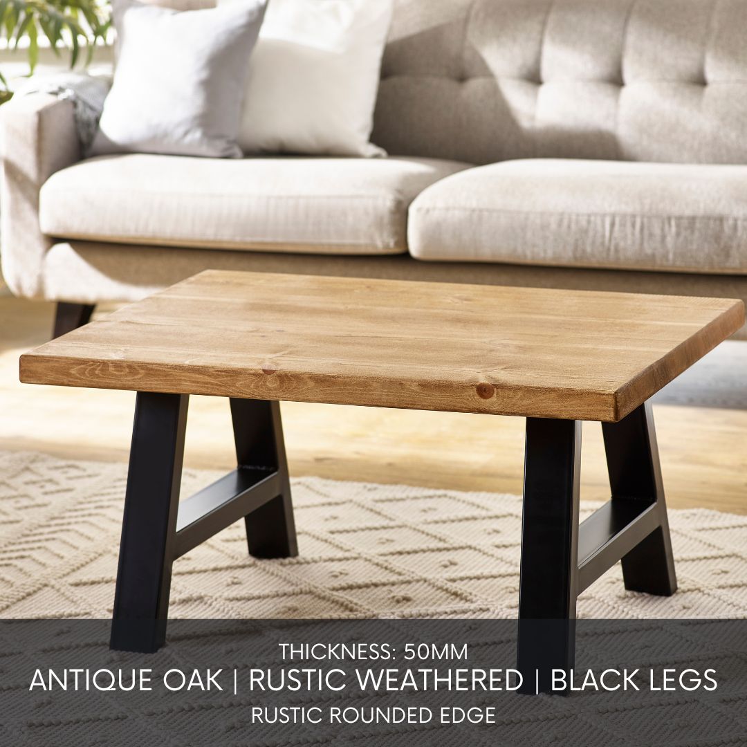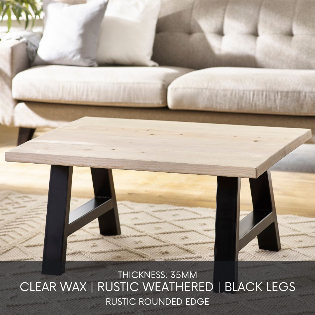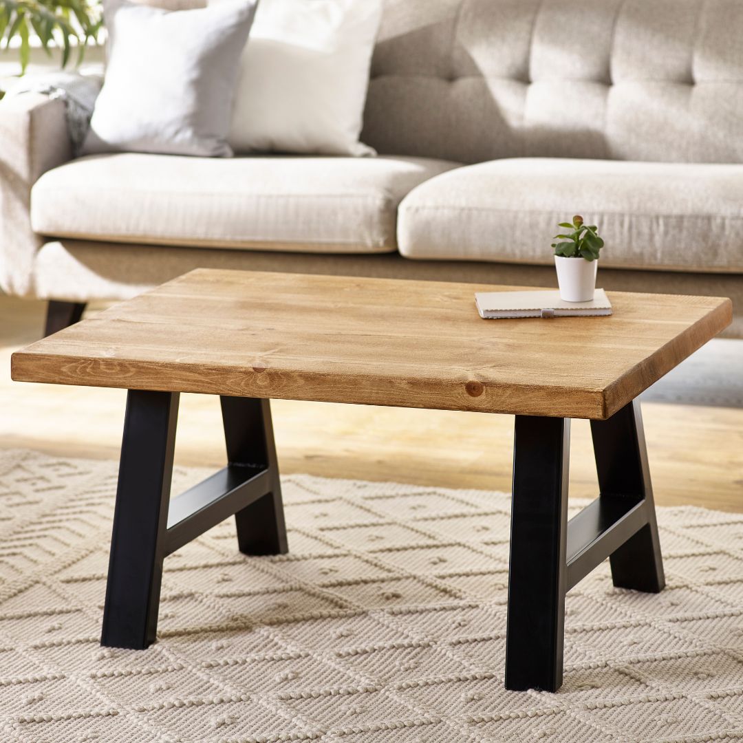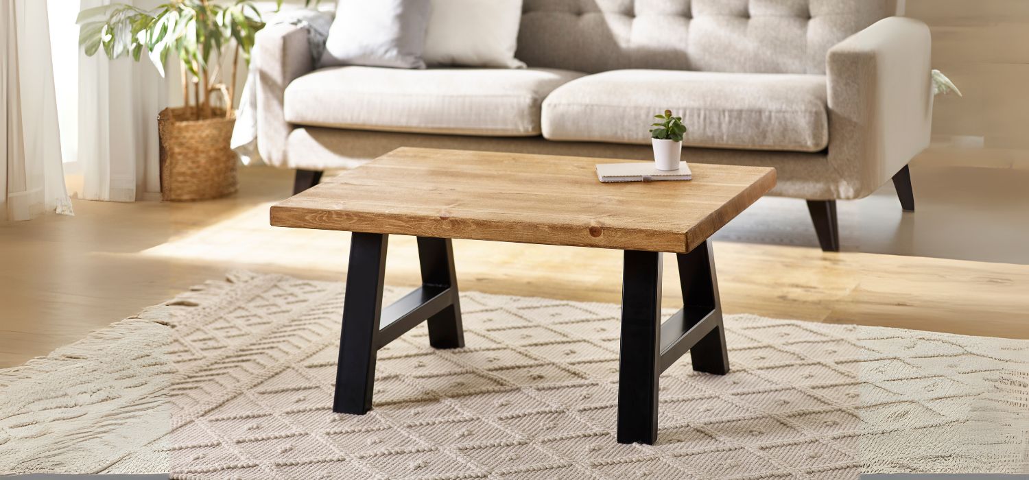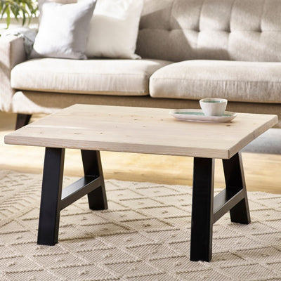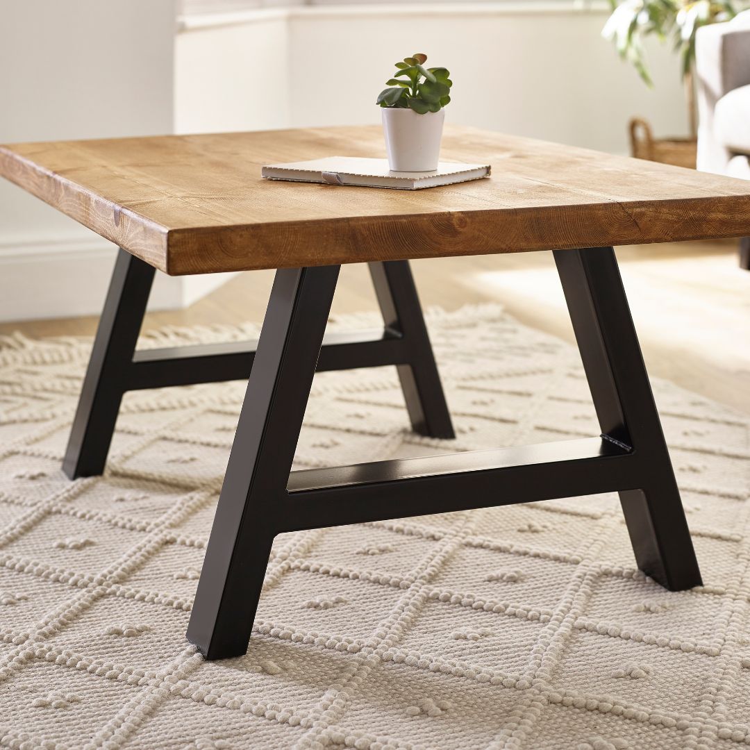 The Arnison Coffee Table features a thick, solid wood top with naturally weathered grain and character markings. Its black powder-coated trestle-style legs ground the piece with a sculptural, modern edge, bringing strength and rustic simplicity to the heart of the living room.