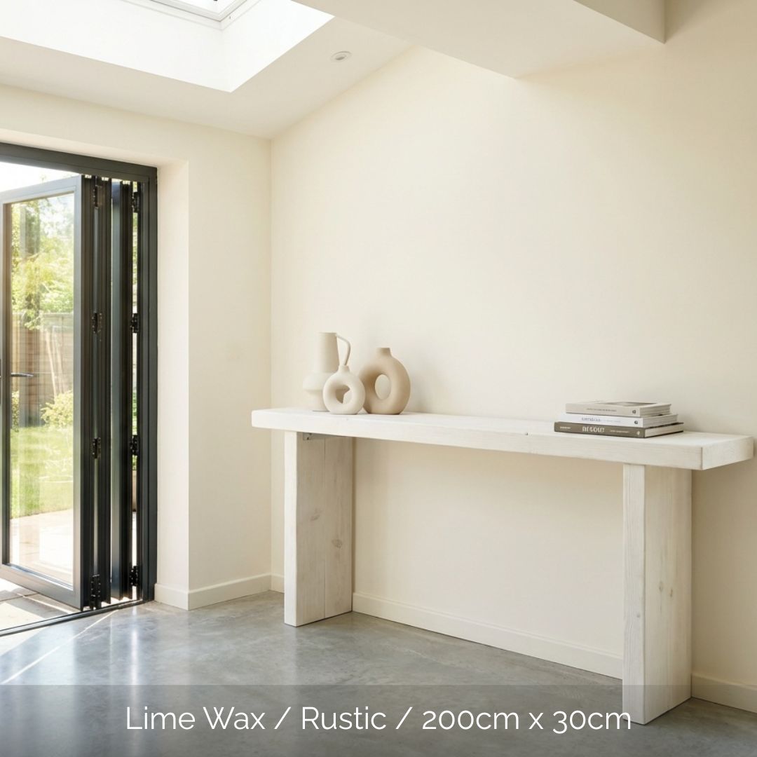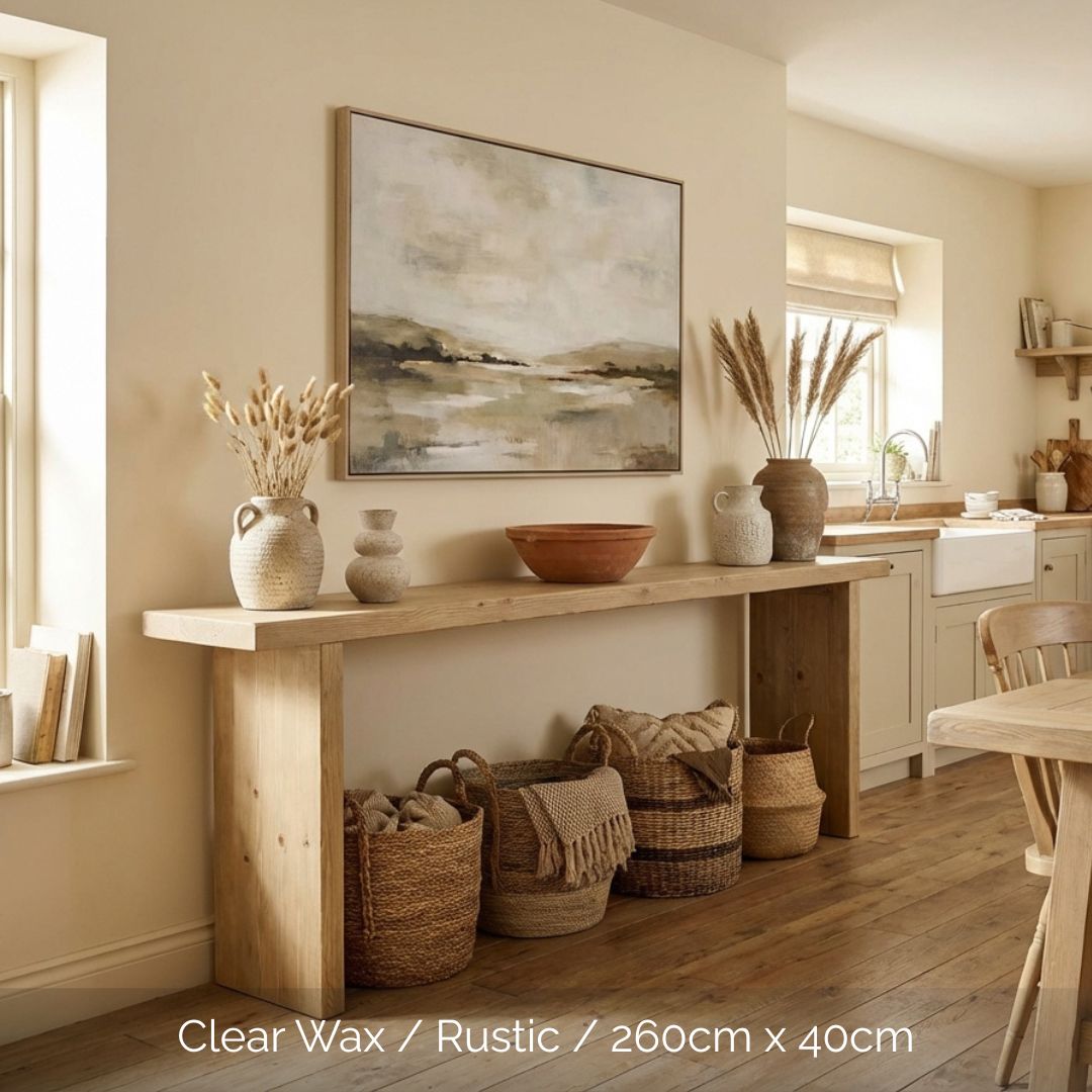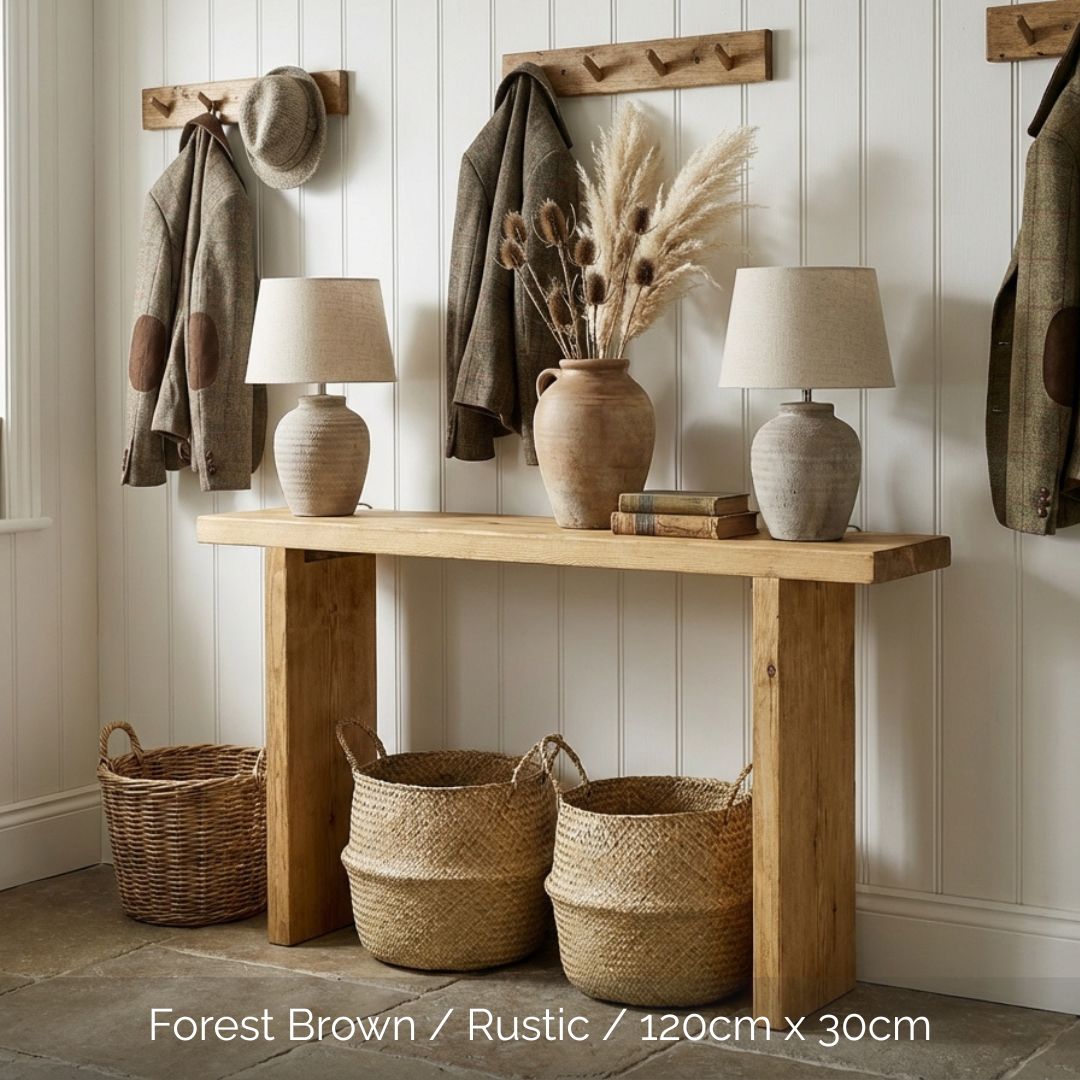 The Bowness Rustic Console Table blends rugged farmhouse character with modern industrial strength. Its thick, reclaimed scaffold-board desktop features a beautifully textured grain, expertly finished by hand with two coats of Fiddes Supreme Wax to enhance its natural beauty and depth.generous coats of Fiddes Supreme Wax.
