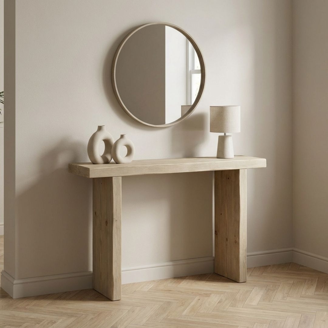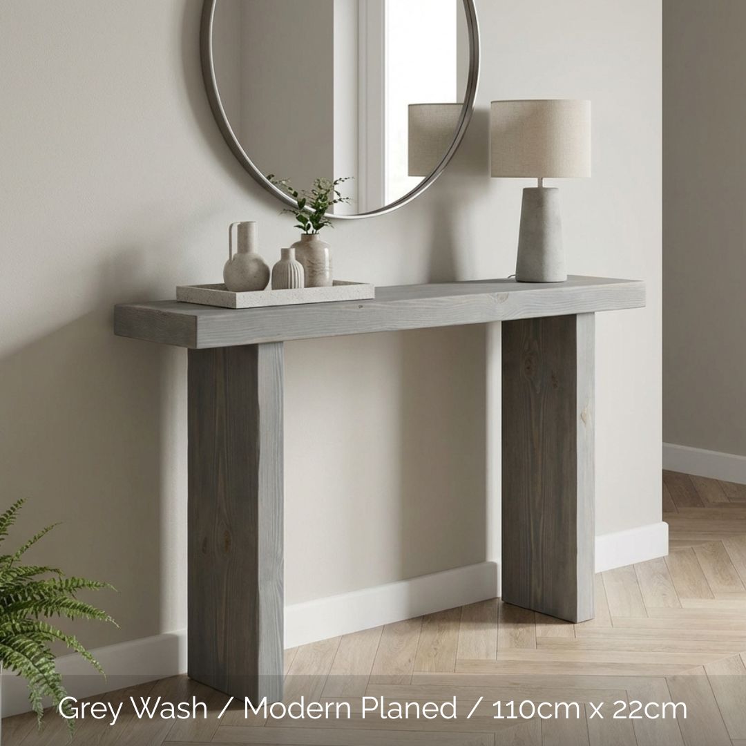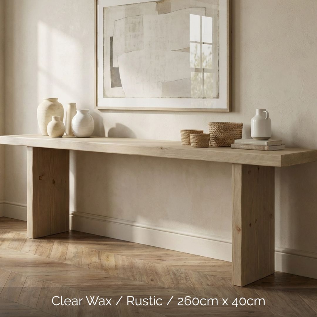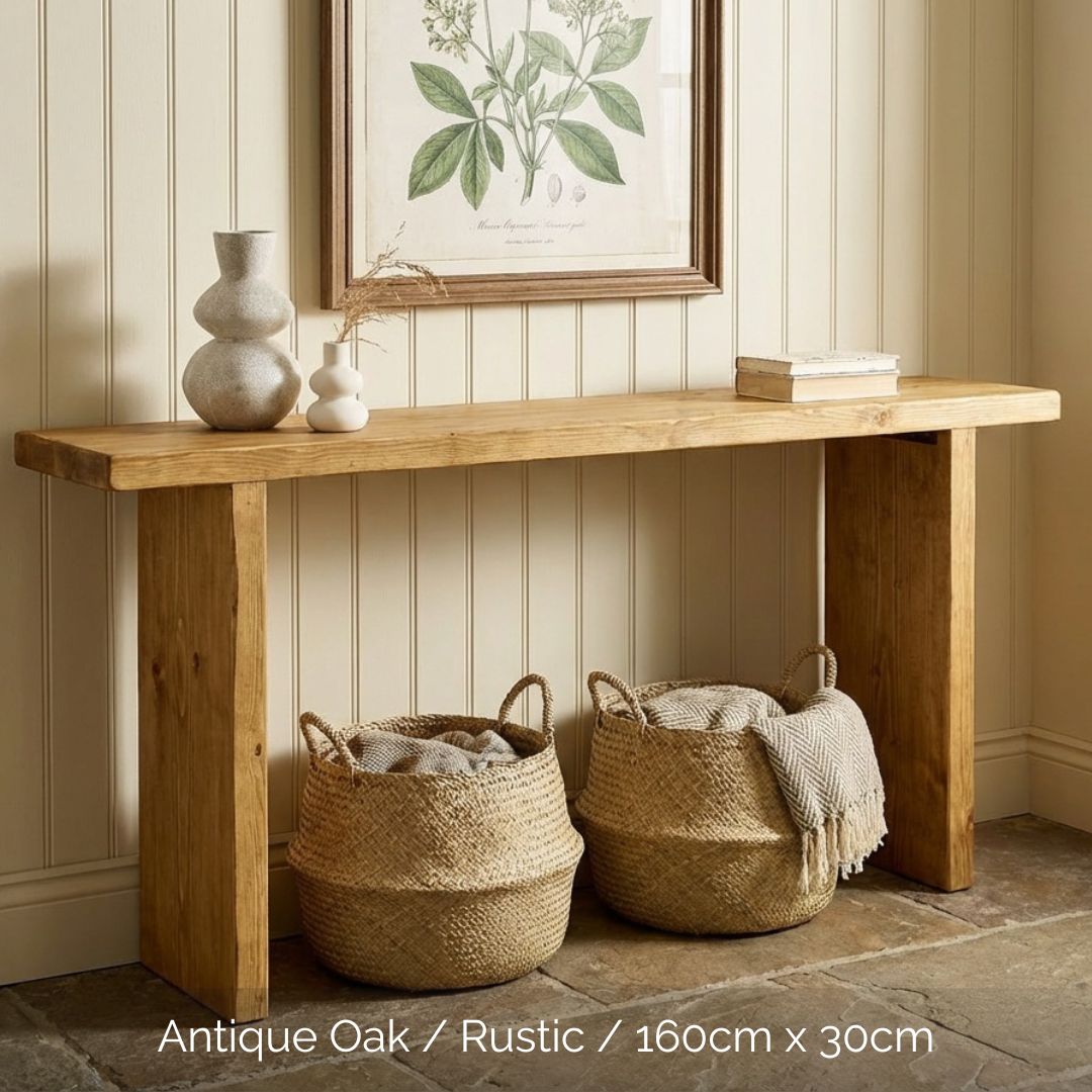 The Bowness Rustic Console Table blends rugged farmhouse character with modern industrial strength. Its thick, reclaimed scaffold-board desktop features a beautifully textured grain, expertly finished by hand with two coats of Fiddes Supreme Wax to enhance its natural beauty and depth.generous coats of Fiddes Supreme Wax.